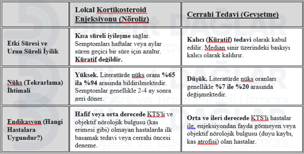 Özetle olarak hafif ve yeni başlayan olgularda enjeksiyonlar denenebilirken, hastalığın kalıcı olarak tedavisi ve uzun süreli, nükssüz bir iyilik hali için bilimsel veriler cerrahi dekompresyonun üstün olduğunu göstermektedir. Objektif nörolojik bulguları (kas gücü kaybı veya duyu kaybı) olan hastalarda ise cerrahi, sinirde kalıcı hasarı önlemek için zorunlu ve gecikmemesi gereken bir tedavi yöntemidir.